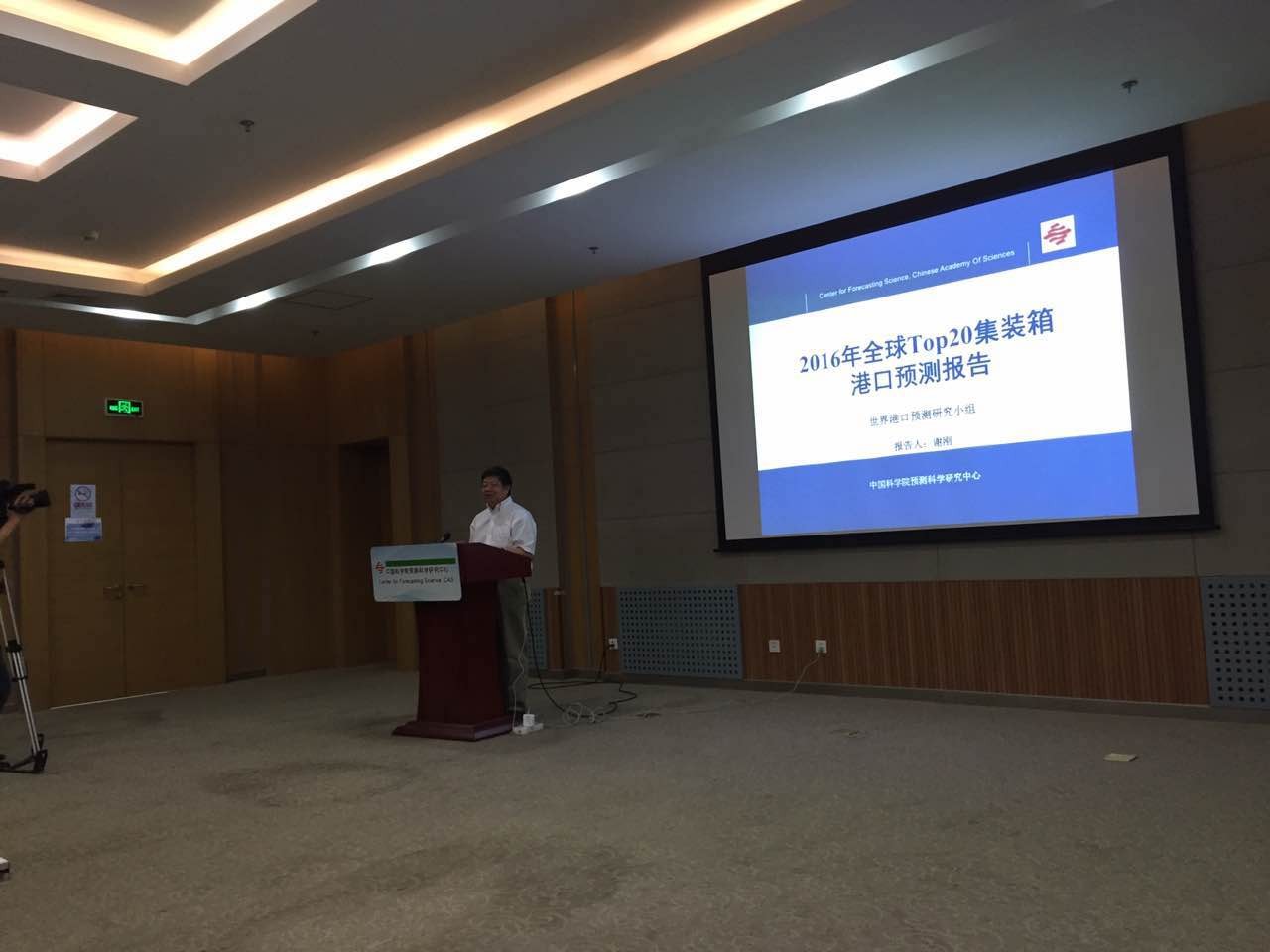 2016年7月12日(星期二)上午10:00-11:50,中国科学院预测科学研究中心(以下简称中科院预测中心)在北京举办了《2016年全球Top20集装箱港口预测报告》、《2016年中国航空客运Top20机场预测报告》、《2016年中国航空货运Top20机场预测报告》发布会暨港航发展论坛。全面详尽地发布和介绍了2016年全球Top20集装箱港口、中国航空客运Top20机场、中国航空货运Top20机场吞吐量和排名预测。会议由中国科学院预测科学研究中心主任汪寿阳主持,谢刚教授发布三个报告的主要结论,随后,大连海事大学民航业数据分析与安全管理决策实验室主任匡海波教授发言,指出了中国港口发展中存在问题,并提出政策建议。新华社、中央电视台、中新社等媒体进行了采访并报道。