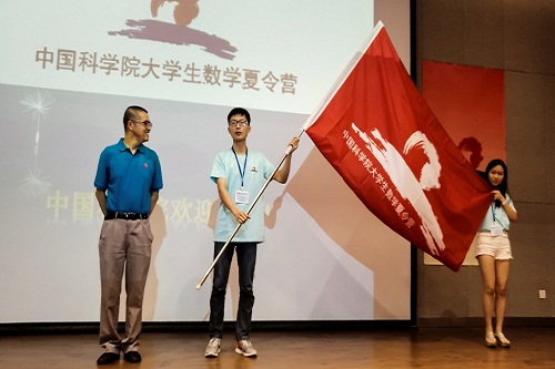 在全场热烈的掌声中,王跃飞院长为夏令营营员授旗。营旗徽标的设计简洁大气,寓意深刻,壮阔的海面上一轮喷薄而出的太阳,不仅象征着数学人的自信、青春和力量,更承载着数学前辈们对后起之秀的无限期望。大连理工大学华罗庚班李丹彤同学作为营员代表发言,她表达了对数学家们的敬佩,对中科院这片学术圣地的憧憬与向往。在同学们的热切期待中,副院长巩馥洲宣布“2016年中国科学院大学生数学夏令营”正式开营。