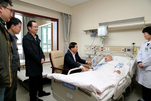随后,白春礼院长向主治医生询问了吴文俊院士的病情。据悉,吴文俊院士经治疗后病情趋于平稳,出血已基本吸收,并发症得到有效控制,嗜睡的情况也大大缓解,再调理两周有望下地行走。主治医生笑称:“爷爷很可爱,也很配合治疗。”白春礼院长向医护人员表达了感谢,并叮嘱医护人员和家人照顾好吴老的日常起居。看望过程中,白春礼院长一直紧握吴文俊院士的手,并告诉大家:“吴老握得很紧,很有力气。”