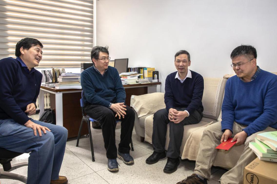 1月29日上午,院长席南华院士、党委书记兼副院长武艰,以及工会主席张立群研究员、工会常务副主席尹永华,来到数学所阮卫东研究员的办公室,亲切看望慰问他。看望过程中,他们从阮卫东研究员家属口中详细了解了阮卫东研究员现在的治疗及恢复情况,询问了他生活中面临的一些困难,鼓励他要积极配合医生的治疗,争取早日康复。