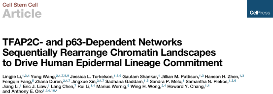 干细胞为人类疾病治疗带来了希望,然而如美国国家卫生研究院国立普通医学科学研究所干细胞生物学基金监管人Marion Zatz说:“干细胞研究中面临的最大挑战之一就是如何调控干细胞转变为一种特异的细胞类型”。针对这一重要的科学问题,王勇研究员与斯坦福大学统计系Wing Hung Wong教授、医学院皮肤系Anthony Oro教授,Howard Chang 教授,李令杰博士等紧密合作,设计实验获取了从全能性干细胞向表皮角质细胞分化期间的匹配的染色质可及性和基因表达时间序列数据,提出了针对转录因子-可及调控元件-靶基因三元组的网络推断模型,揭示了干细胞分化过程中的两个关键的过渡期:表面外胚层起始阶段和角质形成细胞成熟阶段,并分别将TFAP2C和p63鉴定为谱系起始和成熟的关键转录因子。通过功能实验发现TFAP2C而非p63足以启动表面外胚层分化,TFAP2C启动的祖细胞能够成熟为功能性角质形成细胞。机制上,TFAP2C引发表面外胚层染色质状态变化并诱导p63表达,从而允许成熟因子p63正向自动调节其表达并关闭TFAP2C早期启动的部分原始基因,推动分化过程的完成。该工作提供了一个总体建模框架来推断控制染色质状态转换的调控网络,有望促进未来再生医学的进步。