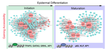 (下):表皮角质细胞分化起始和成熟阶段的调控网络。