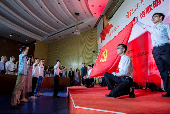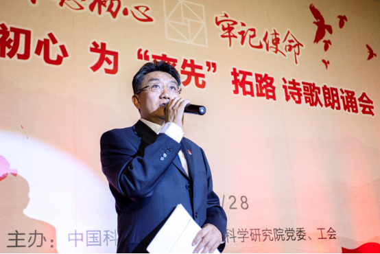 党委书记武艰在致辞中提出,今天的朗诵会会,既是一次学习会、表彰会,也是一次集体党课、主题党日,意义十分重要。他号召广大党员干部以习近平新时代中国特色社会主义思想为指导,不忘初心、牢记使命、攻坚克难、永攀高峰,更加自觉地为实现新时代党的历史使命、建设世界科技强国做出新的更大的贡献。副院长巩馥洲宣读了数学与系统科学研究院先进党支部、优秀党务工作者和优秀共产党员的表彰决定,对5个先进党支部、11名优秀共产党员和11名优秀党务工作者进行了表彰。纪委书记王敬泽带领新党员们,面对鲜红的党旗,庄严宣誓。之后,党委书记武艰以华罗庚先生的一首《破阵子 奉答邓大姐》拉开了朗诵会的序幕。