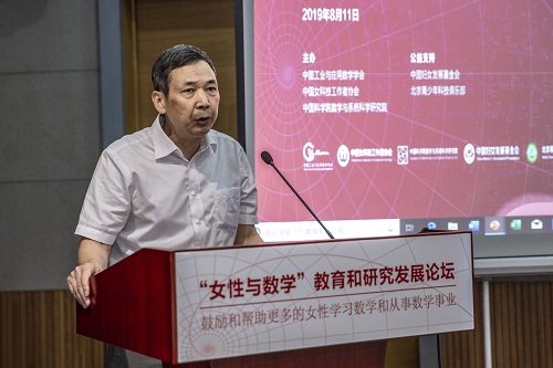 张平文院士代表中国工业与应用数学学会首先致辞,他指出了举办此次论坛的背景,并分析了女性科技工作者比例偏低的现状原因,他肯定了女性科技工作者对教育和科研的贡献,并勉励她们发挥其聪明才智,锦上添花。