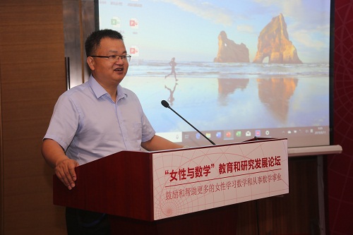贵州民族大学副校长、中国数学会“女数学家和西部数学发展工作委员会”主任韦维教授作了关于女性数学现状分析的报告,从世界女性科技人才现状简介、中国数学学科女性获科研资助情况、促进女性参与科技的政策措施以及启示与建议方面进行了介绍。