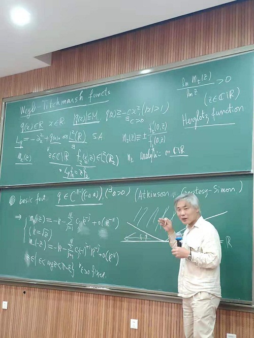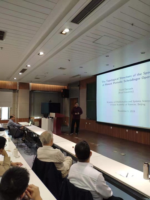 本次研讨会邀请了动力系统和谱理论方面的四位杰出专家作报告。南开大学陈省身数学研究所尤建功教授、美国莱斯大学冠名讲席数学David Damanik教授、日本大阪大学名誉Shinichi KOTANI教授、南京大学王奕倩教授分别作了Arithmetic version of Anderson localization via reducibility; The KdV equation with almost periodic initial data和The topological structure of the spectrum of almost periodic Schrodinger operators;Two topics on Lyapounov exponent和Analytic version of Hirota-Sato theory on KdV equation; On quasi-periodic Schrodinger operators with a C^2 cos-type potential and a large coupling的报告。