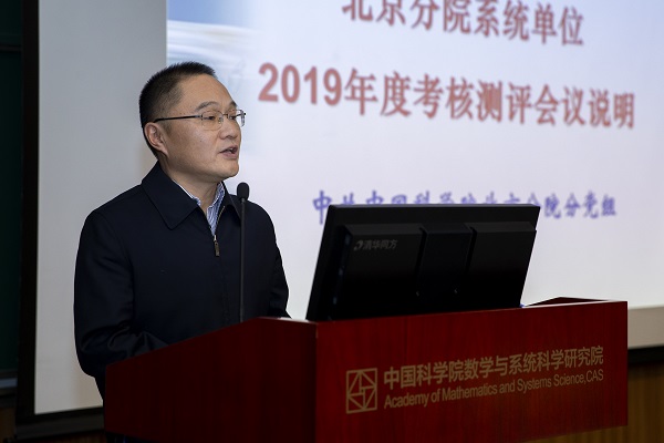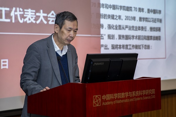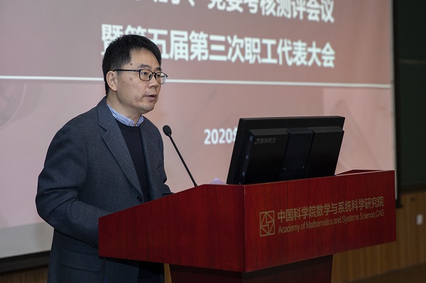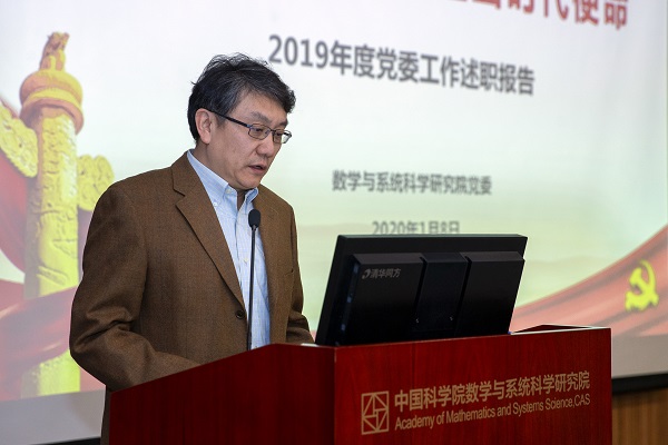 武艰书记代表党委作了主题为“坚守数学初心 担当时代使命”的述职报告。他分别从以主题教育为引领、推动全面从严治党情况,以巡视整改为抓手、提高党建工作质量情况,以70周年庆祝为契机、加强作风和学风建设情况,以大群团协同为基础、凝聚率先行动力量情况等方面进行了详细的汇报,同时也对目前存在的问题及2020年的工作设想进行了介绍。