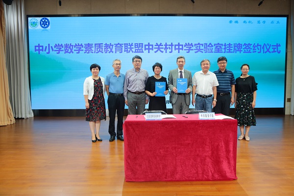 在海淀教委王方主任等领导的共同见证下,数学院院长席南华院士、中关村中学校长苏纾分别代表双方签署共建协议并为联合实验室揭牌。区教委、国科大及中关村中学相关领导为双方导师颁发了证书。中小学数学素质教育联盟中关村中学实验室由中科院数学院、中国科学院大学数学科学学院、中国数学会和北京市中关村中学联合共建。实验室将围绕数学素养校本课程建设、课程基地建设、教师培训、创新人才贯通培养开展合作。