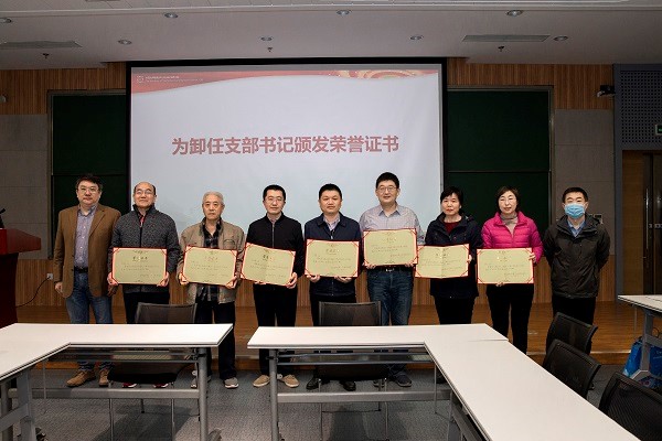 会上,武艰书记宣读了数学院党委关于党支部换届选举的批复文件,同时感谢七位卸任的支部书记为数学院党建工作做出的突出贡献。随后,武艰书记和王敬泽书记为卸任的书记颁发了荣誉证书以表感谢。