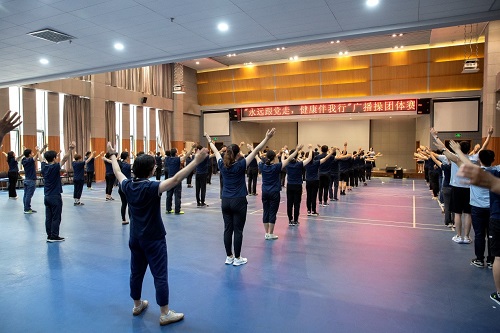 用积极向上的健康行动诠释“永远跟党走”的坚定信念,数学院党委办公室和工会联合举办的“永远跟党走,健康伴我行”广播操团体赛于7月9日中午在南楼一层报告厅举行。五个分工会分别组织选拔出15名队员参赛,同时首次邀请了10余名学生参加到工会活动中。工会主席张立群老师为大家做赛前动员。为保证比赛的公平公正,纪委王敬泽书记担任此次比赛的裁判长,向大家宣读评分方法和标准,五名学生作为裁判进行评分。