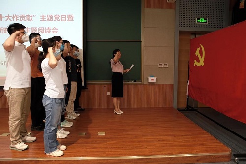 在党员宣誓环节,十余名新发展的党员在党办主任丁晓蕾的带领下,面向党旗,举起右手,庄严宣誓,一声声铿锵有力的宣誓声响彻会场。