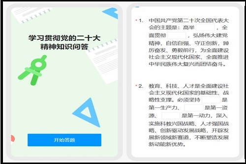 为更好地学习贯彻落实党的二十大精神,2022年10月20日至25日,党委办公室和工会联合举办“学习贯彻党的二十大精神知识问答”活动,400余名党员群众参与此次答题活动。