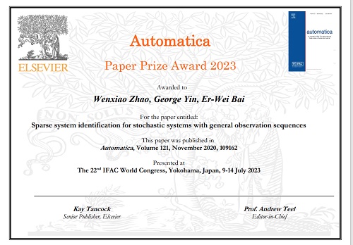 近期,中科院数学与系统科学研究院系统控制重点实验室的赵文虓研究员接到国际自动控制联合会(IFAC)奖励委员会主席Janan Zaytoon来信,通知赵文虓研究员与美国康纳狄格大学殷刚教授、美国爱荷华大学白尔维教授2020年合作发表在IFAC的旗舰刊物Automatica上的论文“W. X. Zhao, G. Yin, E. W. Bai, Sparse system identification for stochastic systems with general observation sequences, Automatica, 109162, 2020”被评为2020~2022年度最佳论文(Automatica Paper Prize Award)。