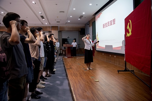 活动在庄严的国歌声中开始。接下来,在领誓人党办主任丁晓蕾同志的带领下,新发展党员面朝党旗,高举右拳,进行神圣的入党宣誓,接受了一次深刻的党性洗礼。