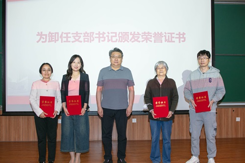 丁晓蕾宣读了数学院党委关于党支部换届选举的批复。武艰书记为卸任的支部书记颁发了荣誉证书,对他们为数学院的党群建设工作做出的贡献表示感谢。