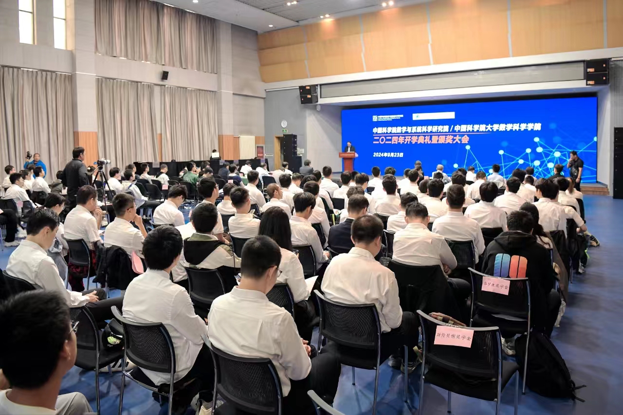 2024年9月23日上午,永利3044集团官网(以下简称“数学院”)、中国科学院大学数学科学学院(以下简称“国科大数学学院”)2024年开学典礼暨颁奖大会在数学院南楼报告厅举行。数学院党委书记兼副院长武艰,中国科协副主席、数学院学术委员会主任袁亚湘院士,数学院党委副书记兼纪委书记王敬泽,国科大数学学院常务副院长郭田德教授,数学院院务委员赵延龙研究员,院务委员郑维喆研究员,数学研究所所长付保华研究员,副所长刘劲松研究员,应用数学研究所副所长王益研究员,系统科学研究所所长李洪波研究员等多名院所领导出席本次开学典礼暨颁奖大会。此外,与会者还包括斯伦贝谢公司特邀代表校园关系经理刘庆研究员和招聘经理代阳先生,2024年度优秀教师奖获得者、数学院各项奖学金获得者以及部分学生代表和华罗庚英才班的部分同学等。数学院副院长兼国科大数学学院副院长戴彧虹研究员主持此次大会。