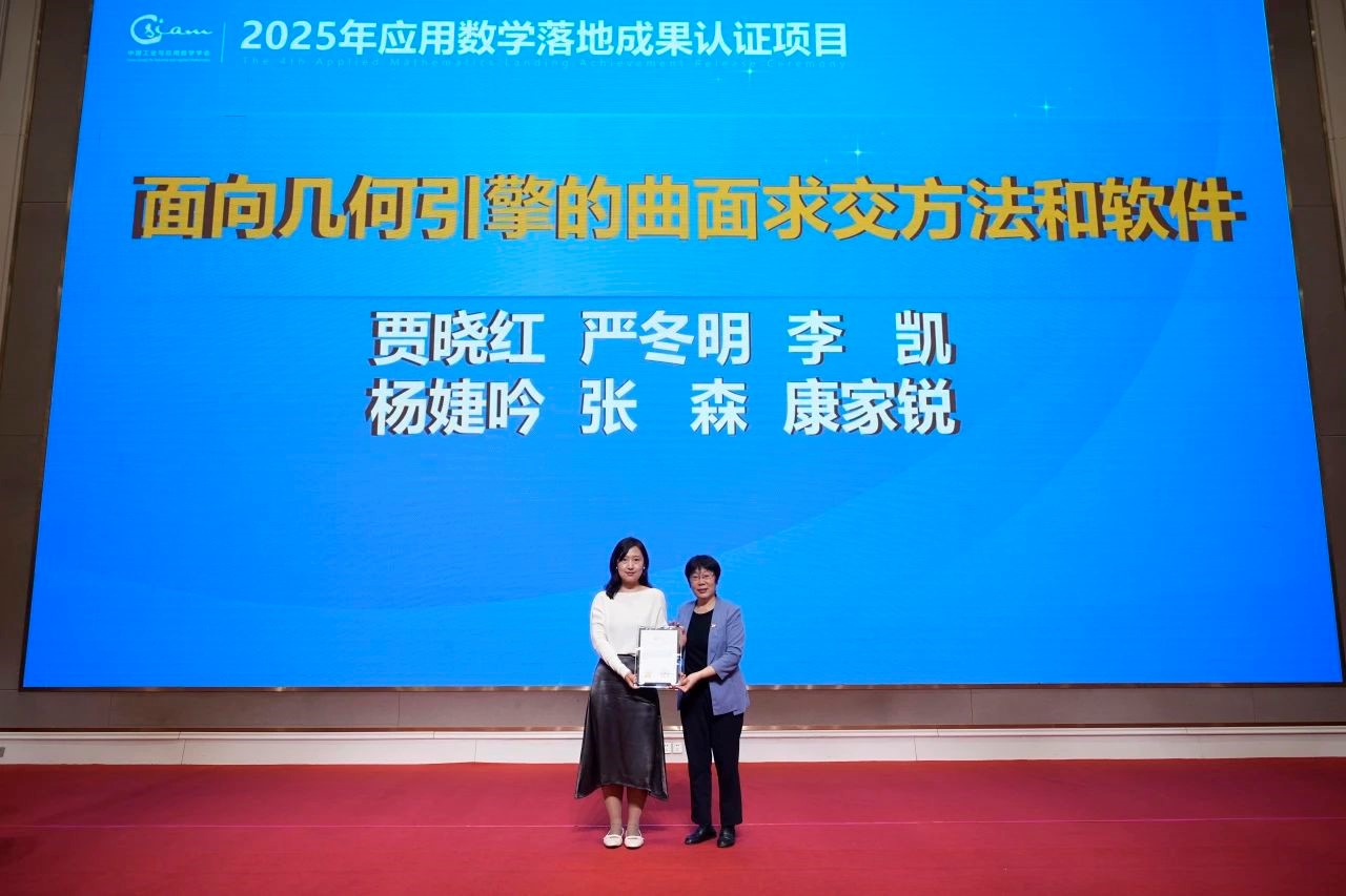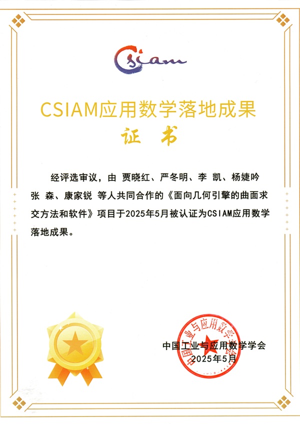 永利3044集团官网、中国科学院自动化研究所的贾晓红、严冬明、李凯、杨婕吟、张森、康家锐等共同完成的“面向几何引擎的曲面求交方法和软件”项目获得2025年CSIAM应用数学落地成果认证。