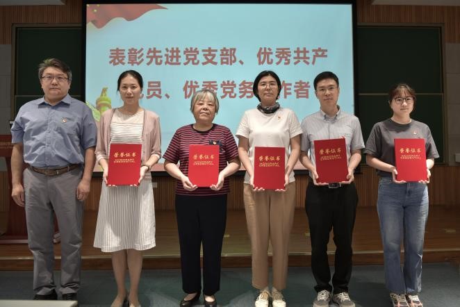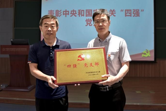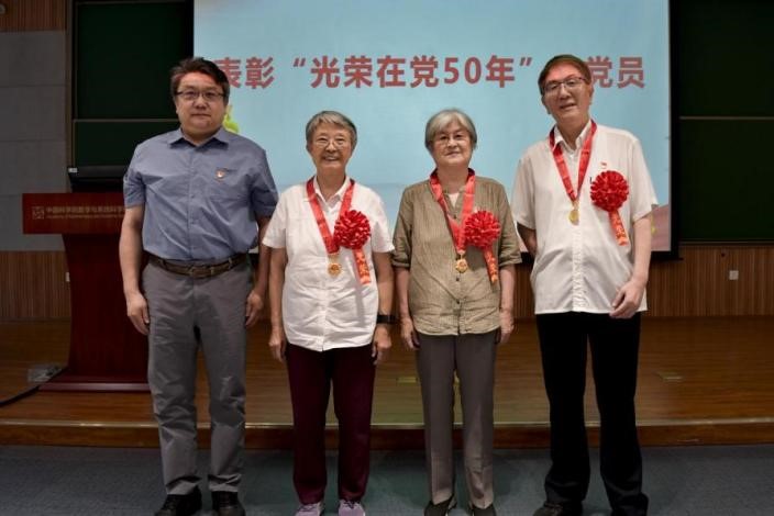 表彰阶段,武艰书记为获得“光荣在党50年”纪念章的老党员李凤翎同志、杨新华同志和乔京城同志颁发了纪念章并合影。王敬泽书记为获得中央和国家机关“四强”党支部的应用所第三党支部颁发奖章并合影。