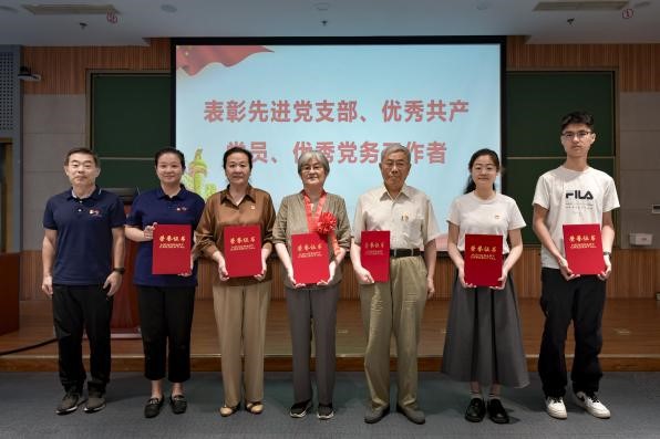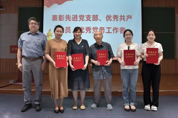 接下来,武艰书记宣读了数学院关于表彰2025年度“两优一先”决定的文件。武艰书记和王敬泽书记分别为先进党支部、优秀共产党员、优秀党务工作者颁发证书并合影。