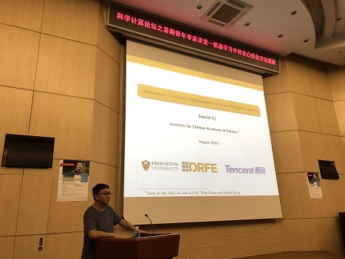 2018年8月20日至24日,来自普林斯顿大学、腾讯人工智能实验室的李骏驰博士在我院思源楼报告厅作了一周十课时关于《机器学习中的非凸优化方法进展》的系列讲座,主要涉及到随机优化算法,在线主成分分析,用常微分方程、随机微分方程分析分析算法收敛性等内容。
