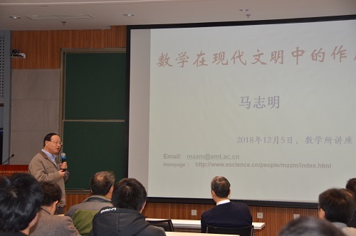 12月5日(星期三)下午马志明院士应邀作了数学所讲座第73讲,演讲的题目是 “数学在现代文明中的作用”。报告由付保华研究员主持,席南华院长、林群院士、武艰书记、张平研究员等近百位师生聆听了此次讲座。